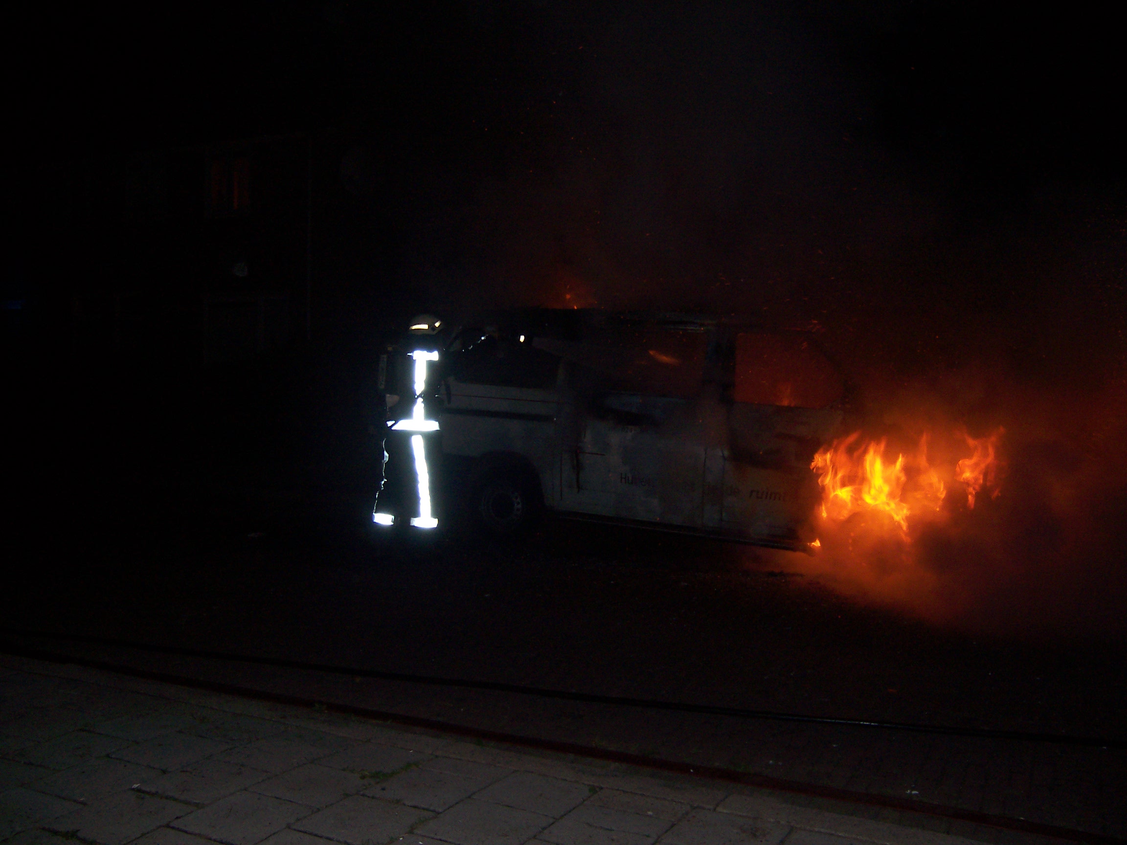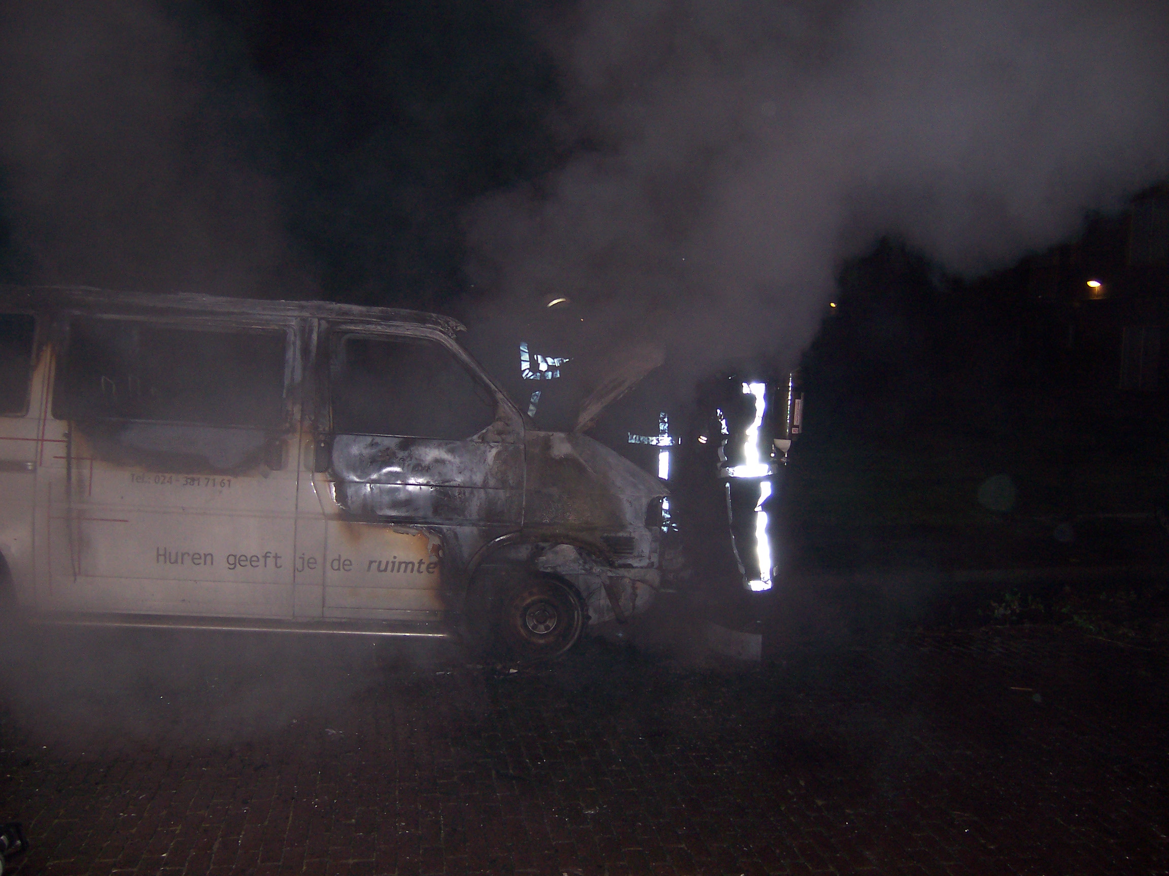 Achter de grote bestelbus, voor de kleine. De brandweer is net klaar met blussen van de auto's in de Laan van Presikhaaf.